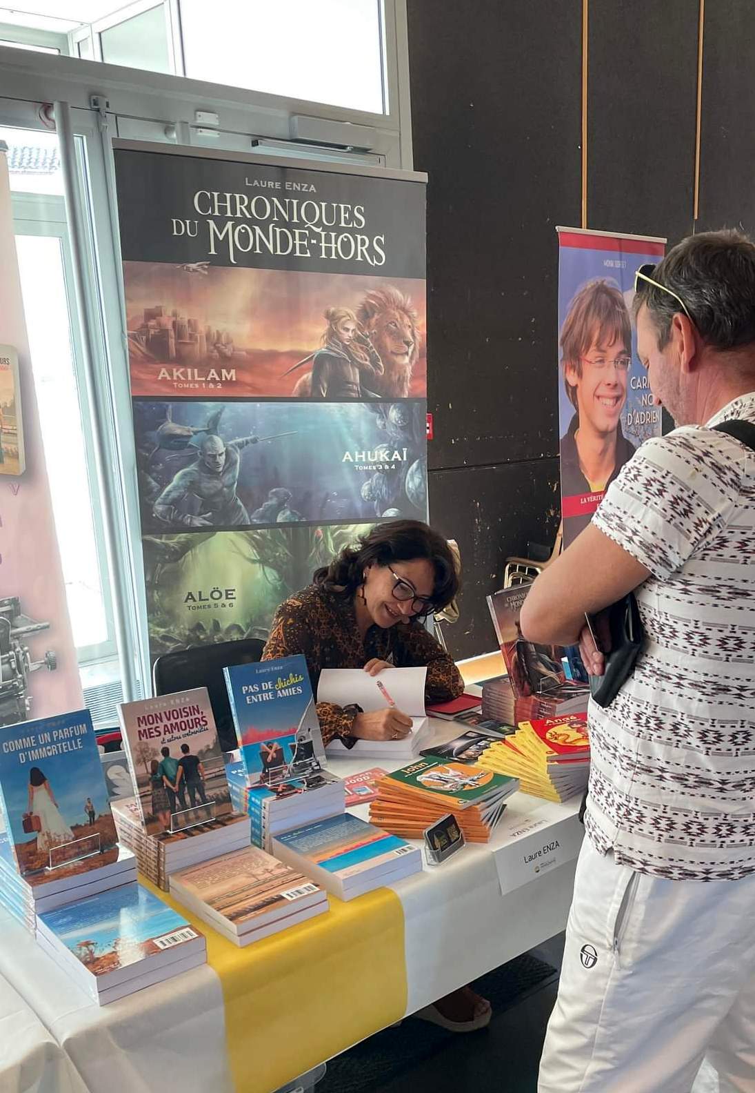 En 2022, j’ai eu la chance d’être invitée à une table ronde animée par Marie Blanche Cordou, qui avait à cœur de faire découvrir les coulisses de l’écriture. J’ai parlé (presque sans bafouiller!) de mon métier, de ce qu’il implique au quotidien maintenant que je suis autrice à temps plein. J’ai évoqué mes rituels, mes doutes, l’élan parfois fragile qu’il faut entretenir pour rester fidèle à sa voix. Pouvoir partager cela, dans ma ville, devant des visages connus et d’autres à apprivoiser, a transformé ce moment en une émotion particulière.