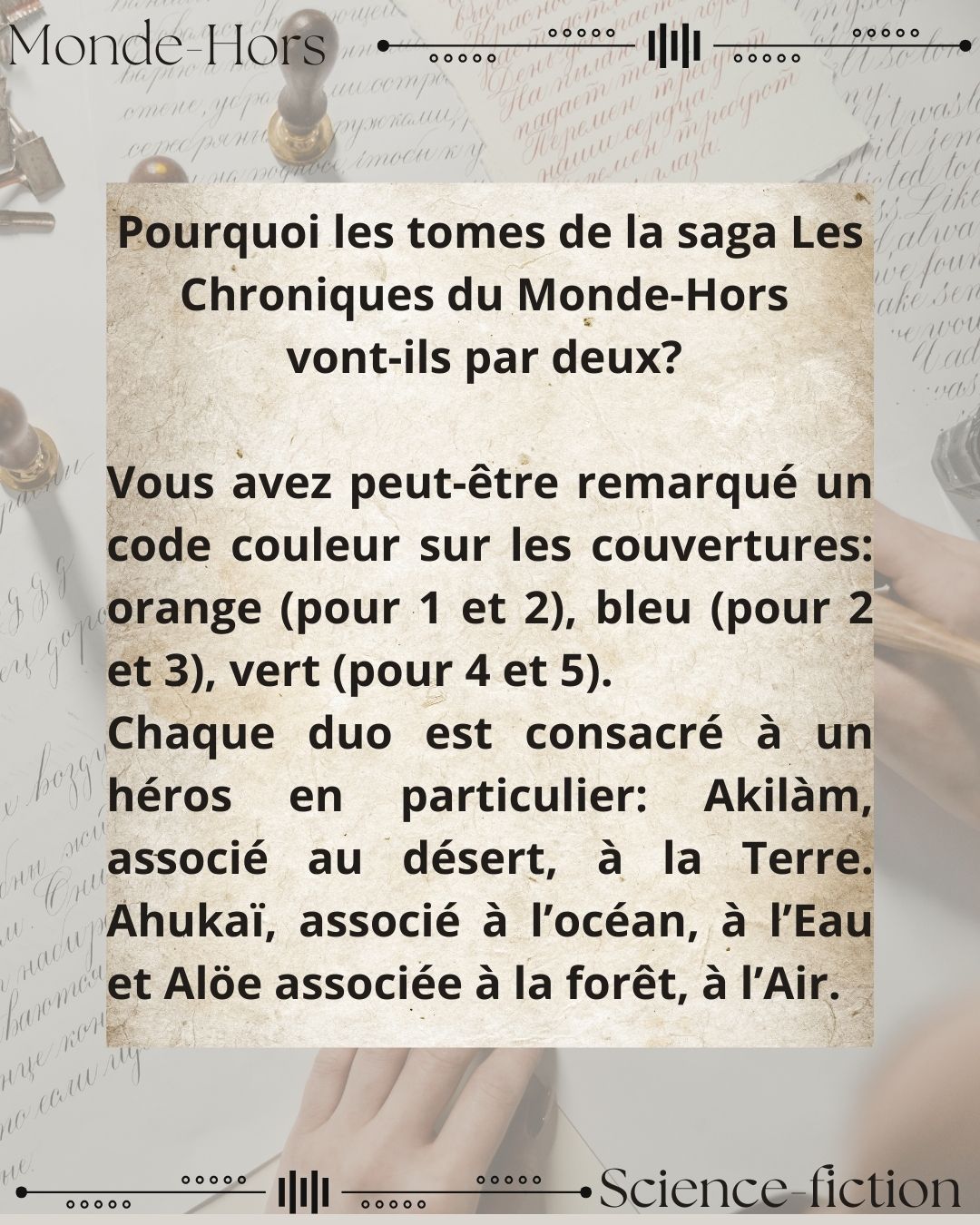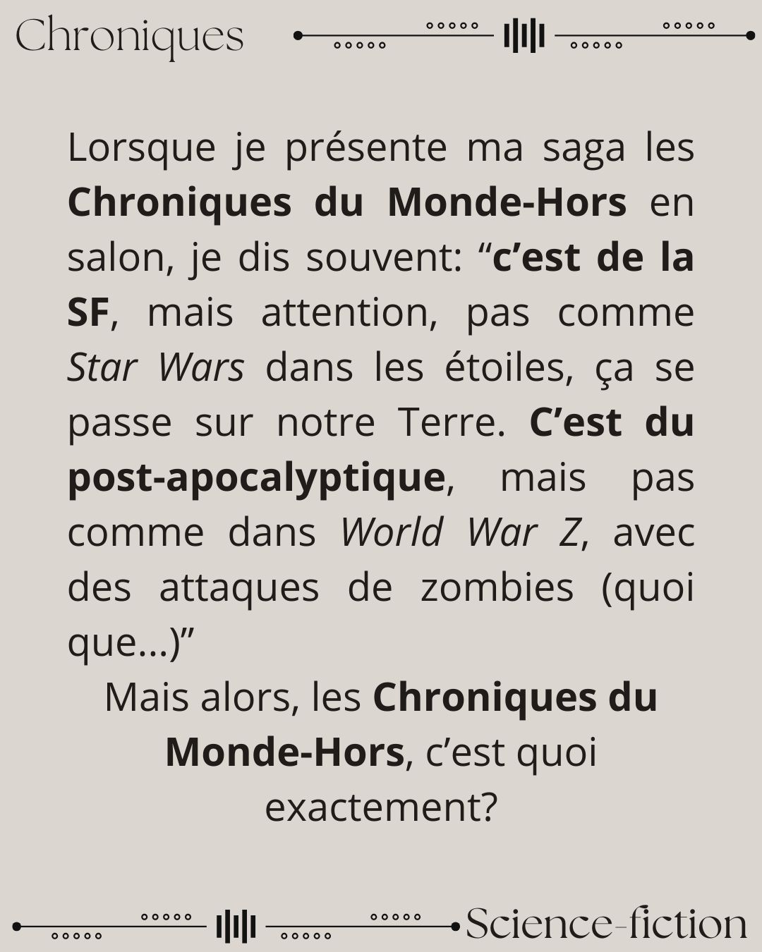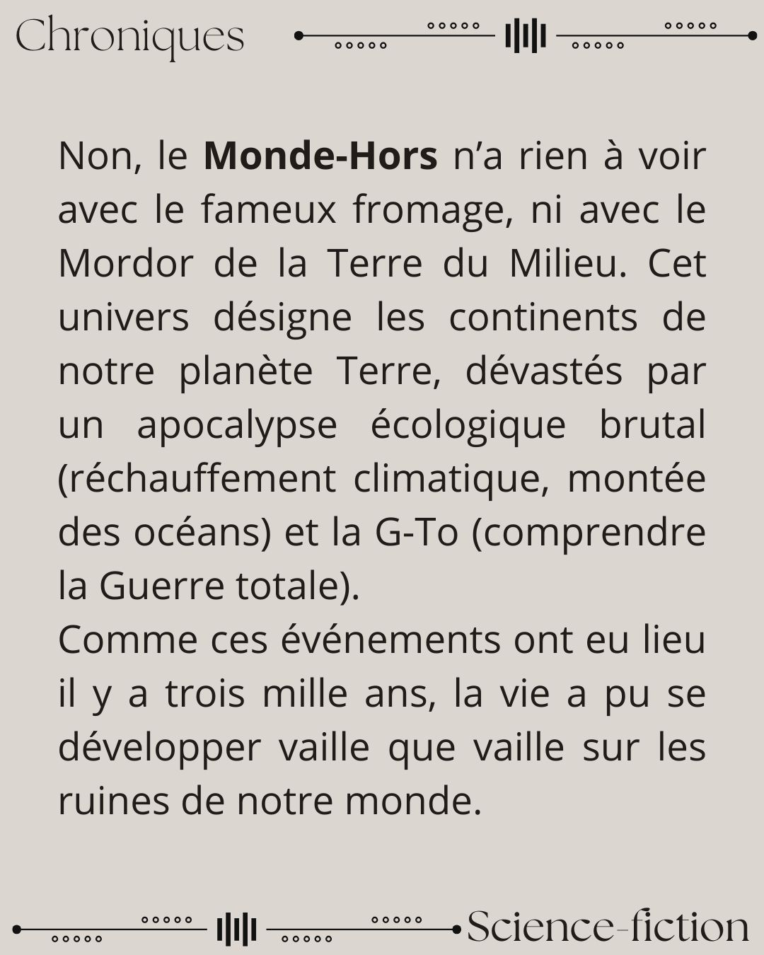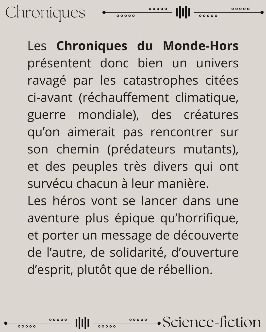 Si vous aimez les sagas, les dystopies, l’écologie, les héros hors du commun, les intrigues de pouvoir, les mutants et les voyages, Les Chroniques du Monde-Hors pourraient vous intéresser. Au départ écrits pour la jeunesse, ces romans séduisent aussi les adultes à l’esprit aventureux.