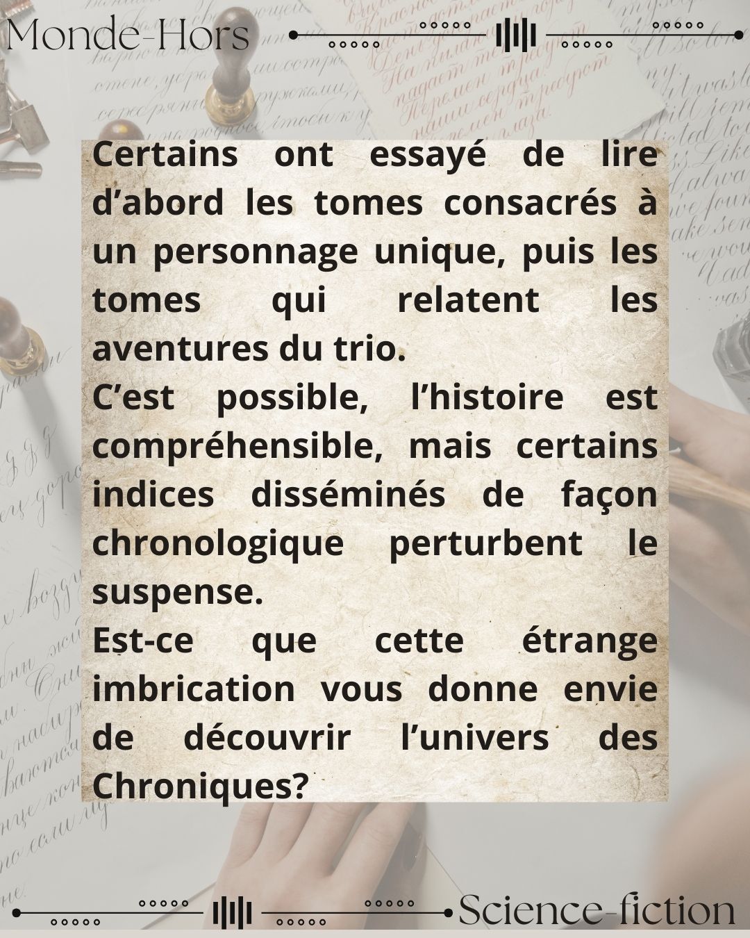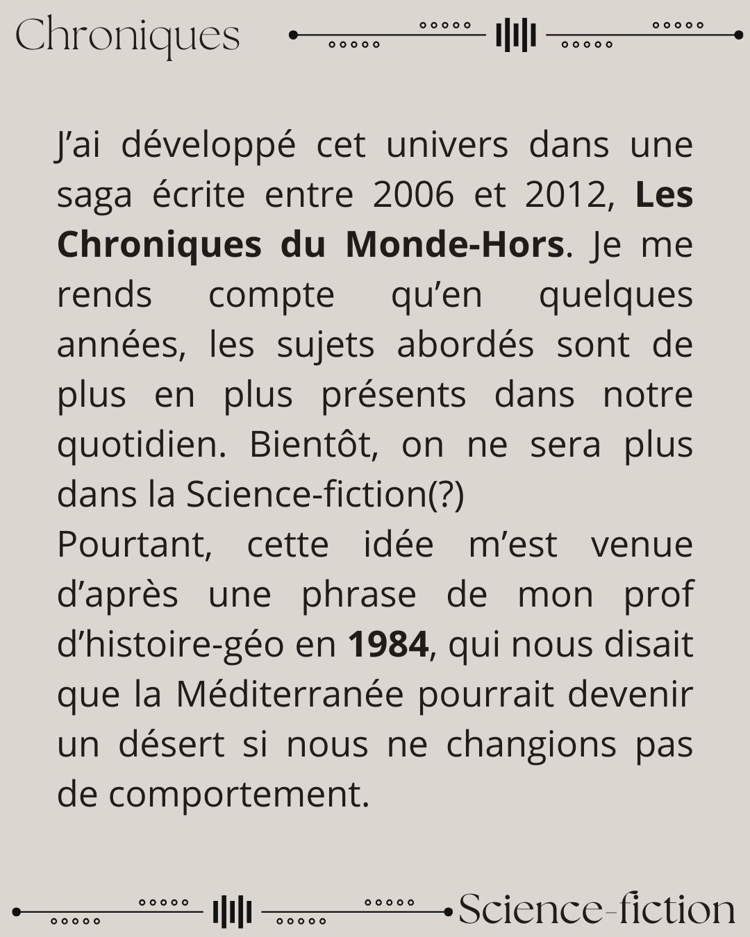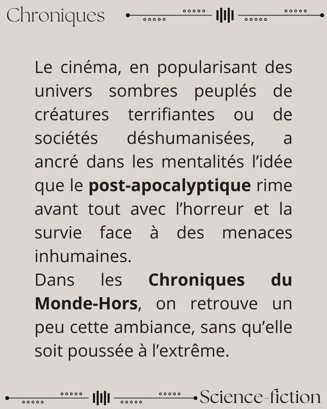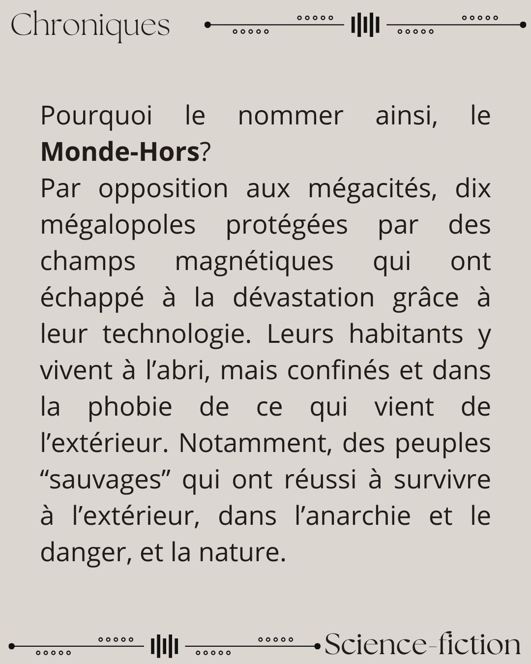 Si vous aimez les sagas, les dystopies, l’écologie, les héros hors du commun, les intrigues de pouvoir, les mutants et les voyages, Les Chroniques du Monde-Hors pourraient vous intéresser. Au départ écrits pour la jeunesse, ces romans séduisent aussi les adultes à l’esprit aventureux.