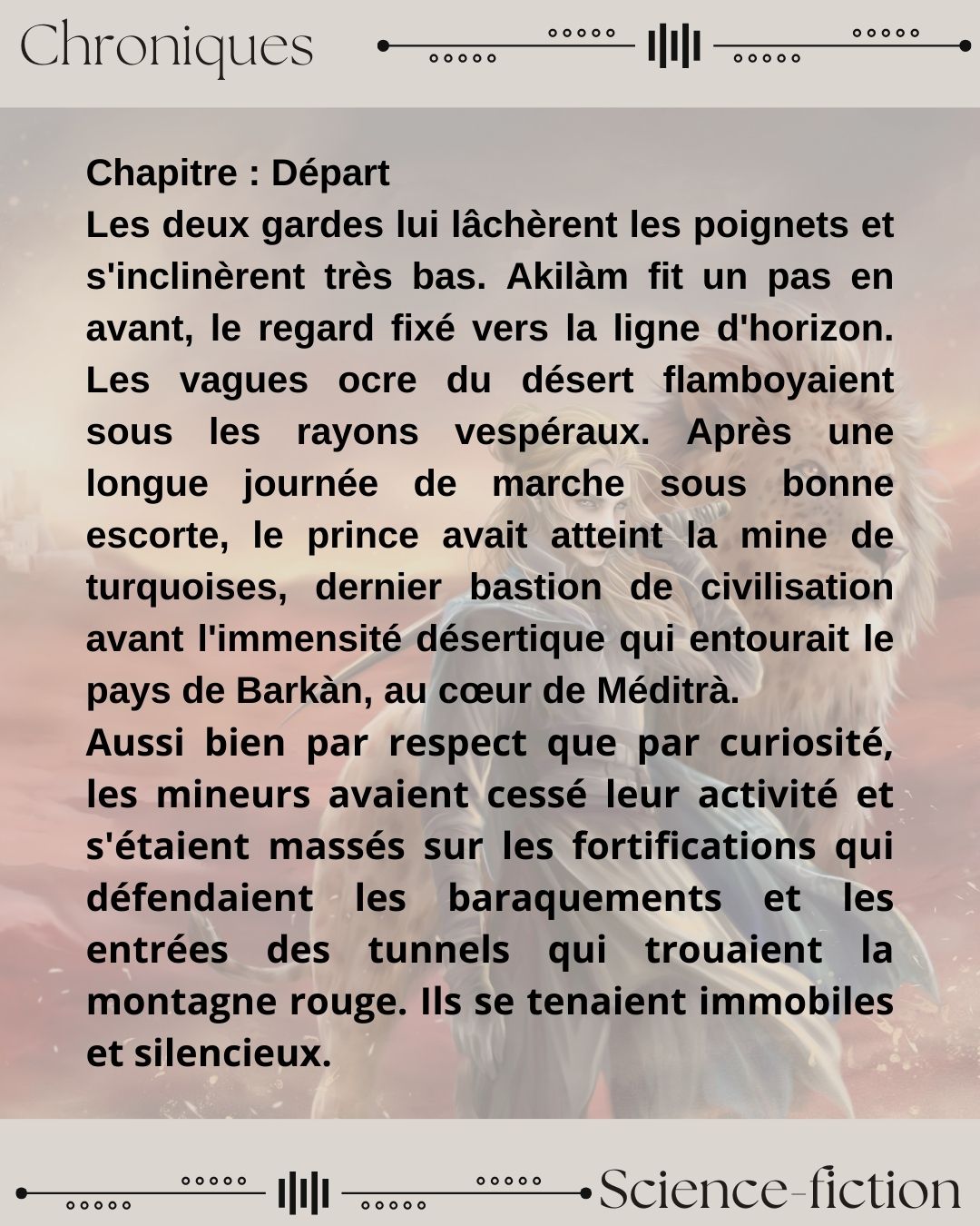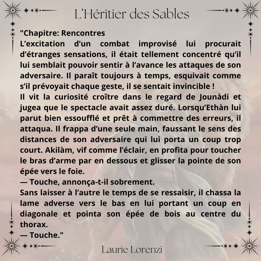 Quel plaisir de me plonger dans l’univers d’Akilàm, 11e enfant du roi Jahlel (et seul garçon), dont la naissance fut soulignée par un drame : la mort de la reine Firouz, sa mère. Pourtant, une force intrépide l’anime dès son plus jeune âge. Curieux de tout, il a surtout l’âge d’un aventurier face à l’immensité d’un monde inconnu, au-delà du désert, qu’il rêve de découvrir. Mystères, complots, amitié pure, courage et détermination, avec Akilàm, c’est notre propre initiation que l’on fait, c’est découvrir un monde insoupçonné où lois cruelles et croyances se mêlent, c’est aller au devant des mêmes dangers, des mêmes doutes et profiter des mêmes moments de bonheur, c’est aussi grandir à ses côtés avec un courage façonné par les épreuves. Sous la plume admirable de Laure Enza, les décors prennent vie avec force détails visuels et olfactifs, on ressent la chaleur étouffante sous le soleil de plomb, on découvre la cité archaïque de Barkàn et son palais royal surplombant les différents quartiers (quartier militaire, ville-majeure, ville-mineure, ville marchande…) entourés d’enceintes. Et, au-delà des remparts, l’immensité du désert, on devine les sons des créatures sauvages qui s’y cachent. Je me suis attachée à ce jeune prince courageux et déterminé au fil de ses propres découvertes, son cœur noble, honnête, et dont la vie est menacée à tout instant. Ce premier opus m’a transportée. C’est vrai, j’aime lire de la Fantasy parce qu’elle projette mon esprit loin de notre réalité et c’est que ce je recherche dans les livres. Pourtant, les Elfes, les Gobelins, les Trolls et la violence « kill them all » qui les caractérisent… très peu pour moi. C’est pourquoi le livre de Laure m’a totalement captivée. Il est issu d’un imaginaire d’une finesse incroyable et m’a immédiatement projetée dans son univers. Son style est fluide et rythmé. J’ai beaucoup aimé les néologismes subtils de l’auteure, la plupart construits à partir de mots existants auxquels quelques lettres ont été retirées, une belle idée. Un coup de génie aussi : l’invention d’une langue, celle du mutant qu’Akilàm va rencontrer. Le premier tome est donc une belle découverte, le tome 2 sera ma prochaine lecture et le tome 3 rejoindra les deux autres rapidement. En un mot, j’adore ! De 11 à 111 ans, la lecture de cette trilogie est un régal.