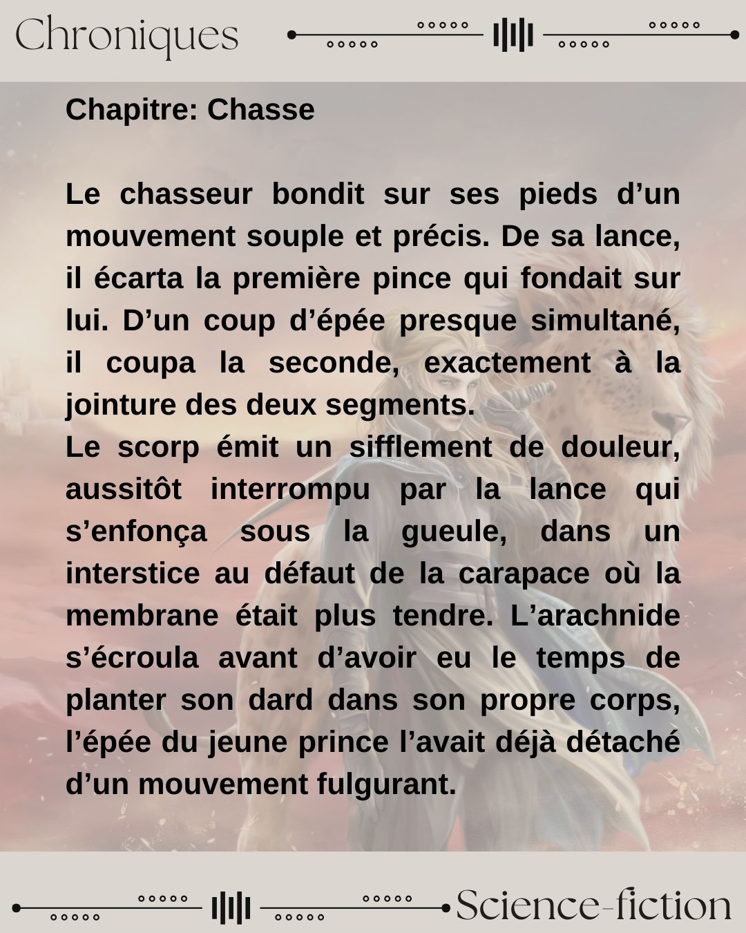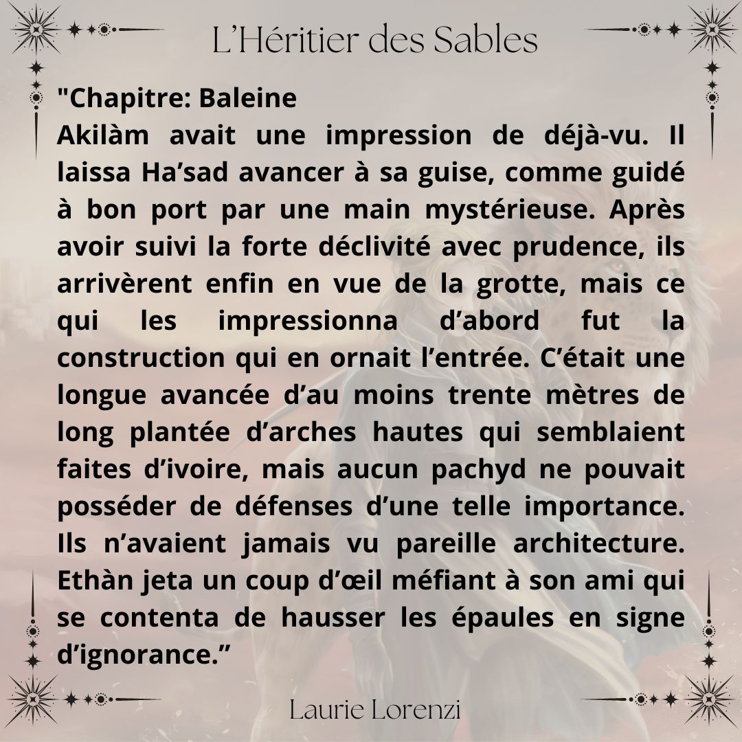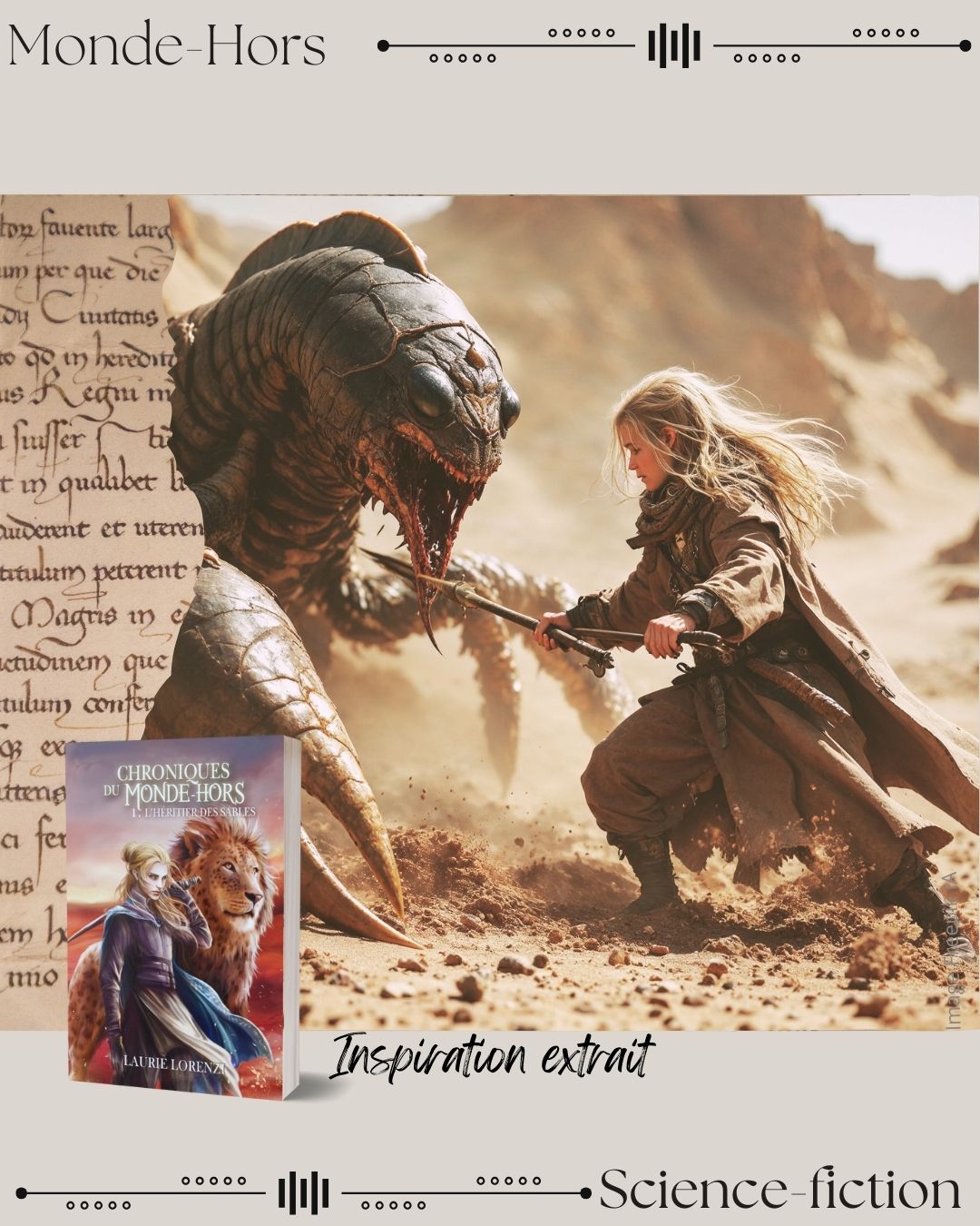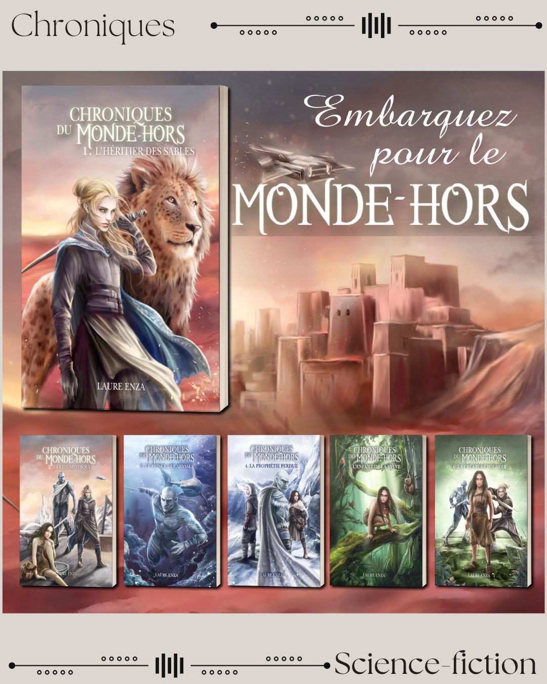 Quel plaisir pour moi de découvrir cette série de Science-Fiction « Chroniques du Monde-hors » de Laure Enza, avec son premier tome « L’HÉRITIER DES SABLES » ! J’ai beaucoup aimé l’écriture de Laure Enza, son style fluide qui coule sans heurt aucun, son rythme qui m’a entraînée à dévorer les pages, ses descriptions qui rendent chaque scène vivante et odorante. Le monde imaginé par l’autrice est d’une précision incroyable. Je me suis retrouvée entièrement plongée dans ce monde aride, visualisant chaque scène, chaque personnage sans aucune difficulté, dans la chaleur, la lumière ou l’obscurité. Laure Enza est allée jusqu’à inventer une nouvelle langue parlée par les mutants, tout à fait compréhensible, mêlant mots anciens et néologismes créés à partir de mots connus, pleine de finesse et d’humour, qui m’a régalée. Beau travail ! J’ai particulièrement été sensible à son évocation des us et coutumes de chaque peuplade. L’autrice propose une réflexion très intéressante en opposant judicieusement le poids des traditions, qui pousse certains à accorder plus d’importance aux règles qu’à leurs concitoyens, avec la force de vie qui pousse d’autres à dépasser ces carcans, à observer leur entourage avec attention et à imaginer d’autres possibles. Les thèmes de la survie, des croyances, de la solidarité, de l’adolescence, du voyage, de l’amitié, de la découverte de soi sont finement abordés. La couverture de Nicolas Jamonneau est vraiment très belle. Un livre de SF comme je les aime, qui imagine notre futur sans oublier la multitude des facettes qui composent l’humanité. Inutile de vous dire que je fonce sur le deuxième tome de cette série « Chroniques du Monde-hors », LA CITÉ MYTHIQUE. Merci infiniment, Laure Enza, pour cet excellent moment de lecture.